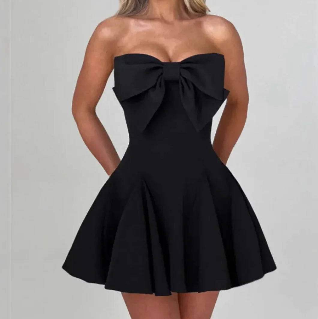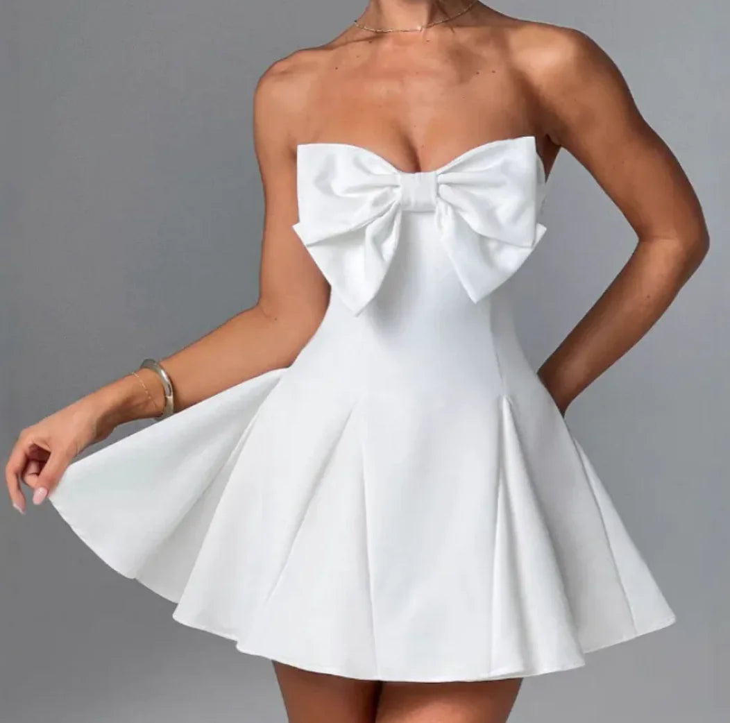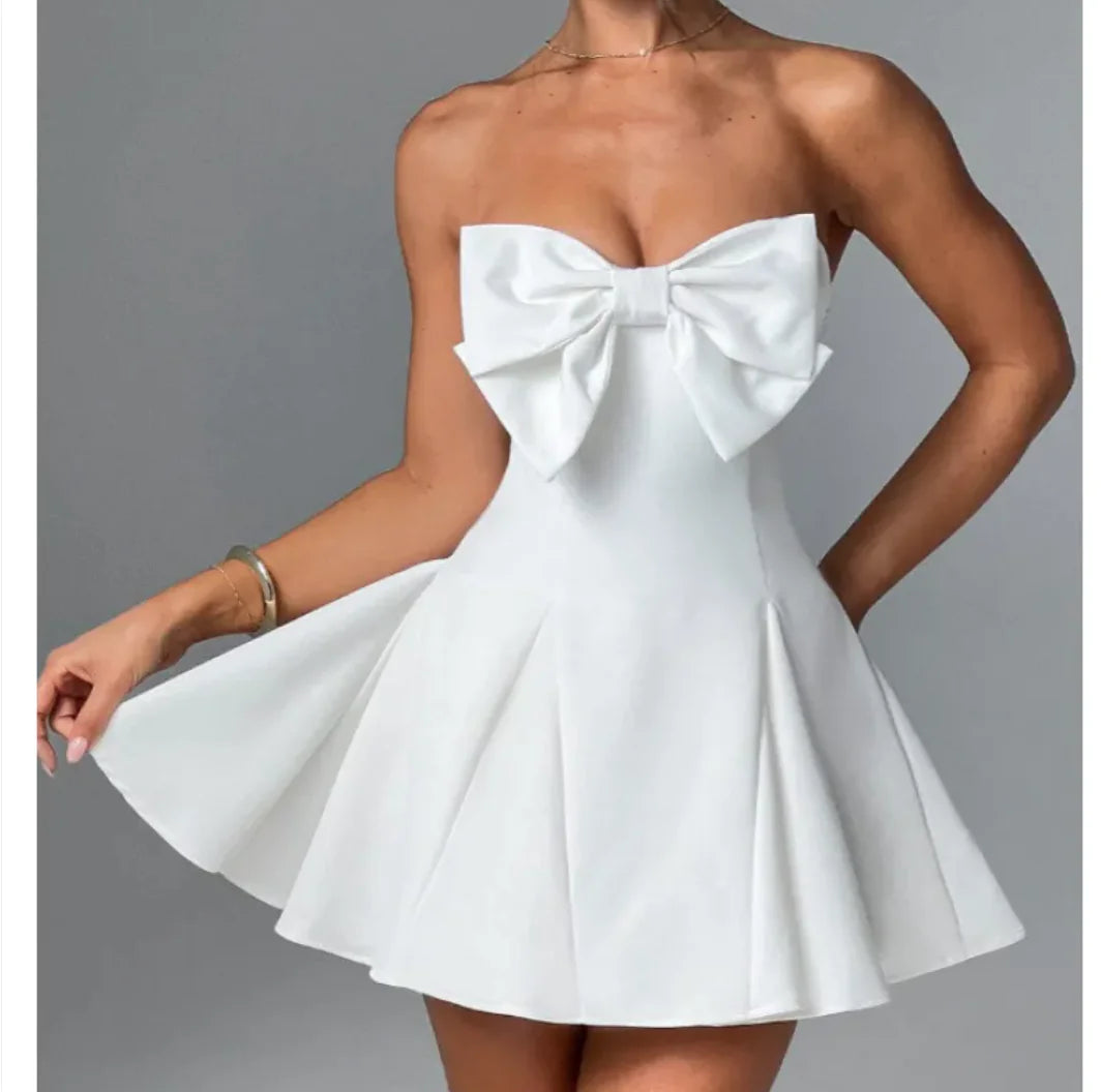Charming tube top short dress with a bowknot detail, features a sweet and feminine style, solid color design, perfect for casual outings or special occasions, crafted for comfort and elegance.