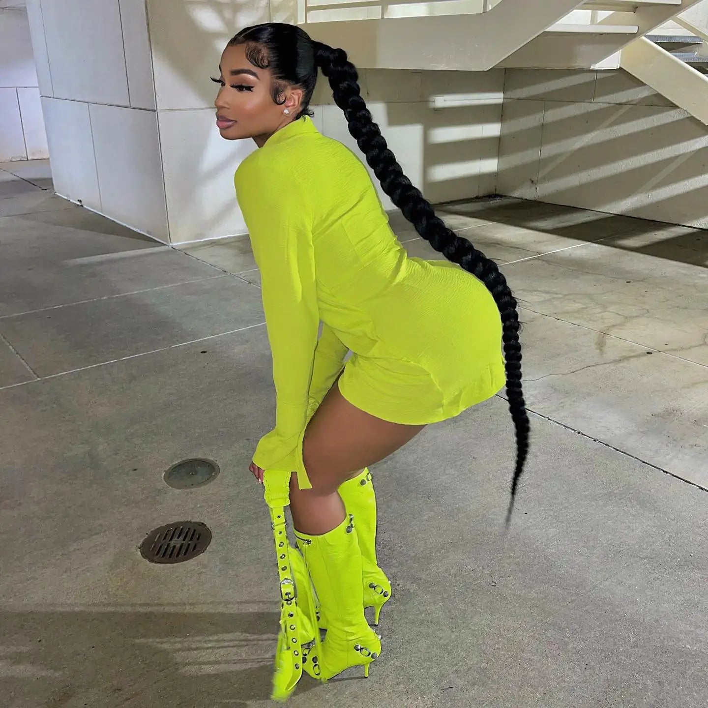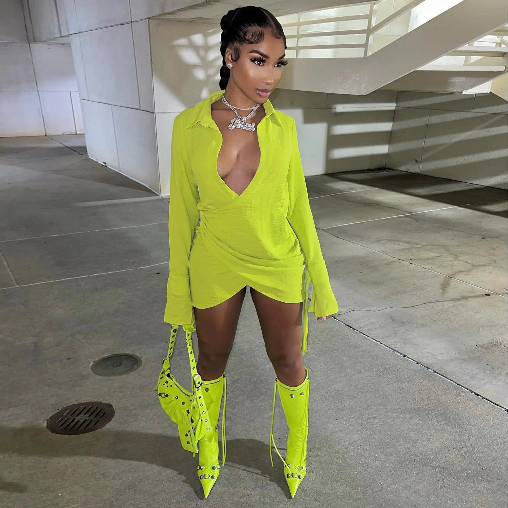 Features:CollaredPlunge/Deep V-NeckLong SleevesWrap Front DesignMini/Above Knee LengthSolid ColorRegular FitFabric: Polyester